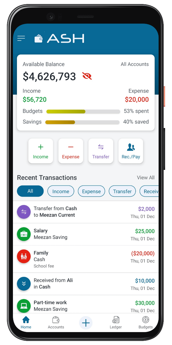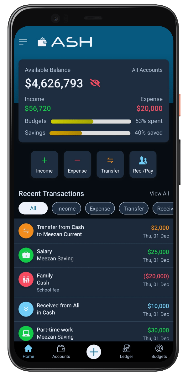 Ash Budget is a beautifully designed mobile app with a modern, sleek, and easy-to-use interface that makes managing your finances attractive and effortless.